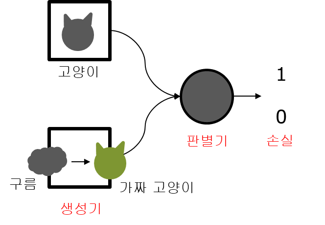 - 판별기는 고양이라는 정답 데이터셋을 훈련하여 1 또는 0 으로 고양이 인지 아닌지 판별한다.